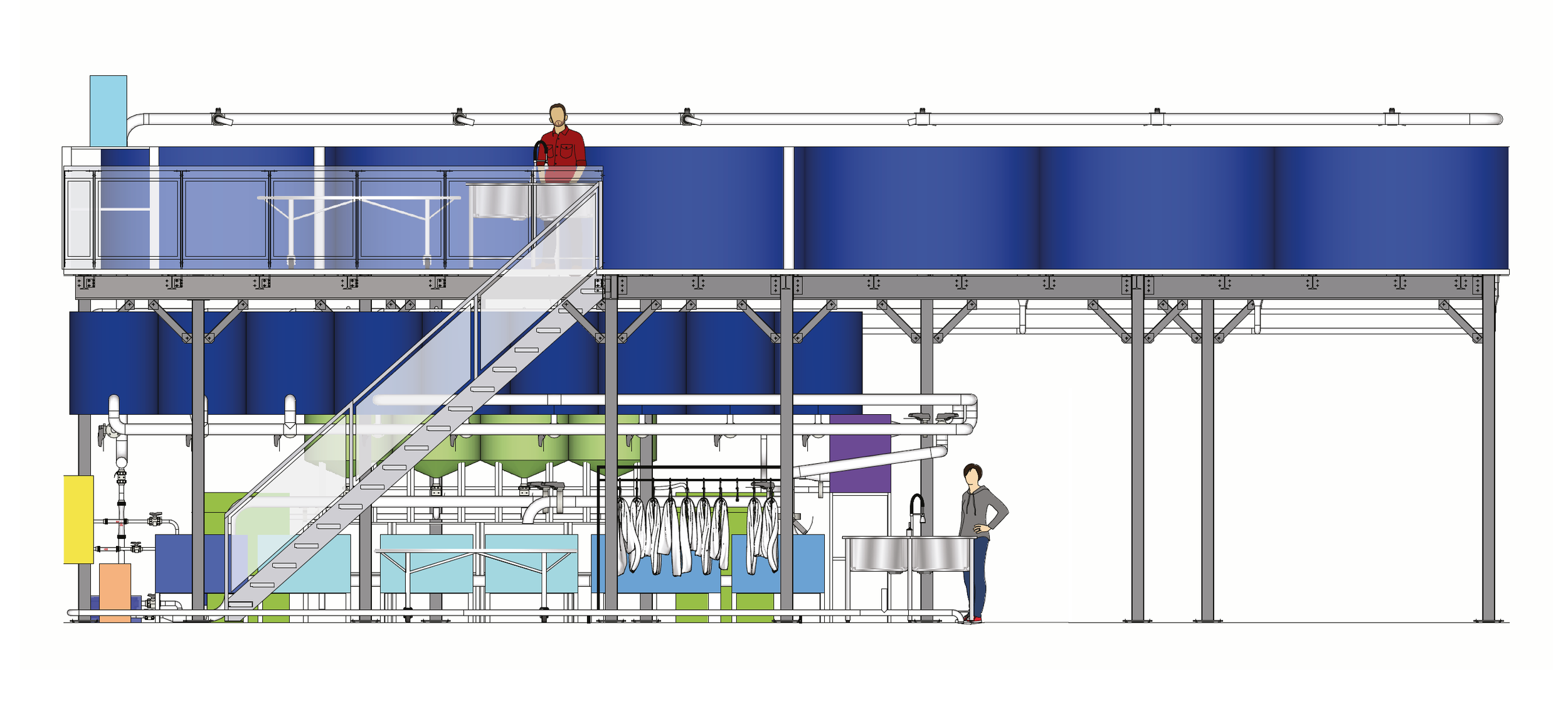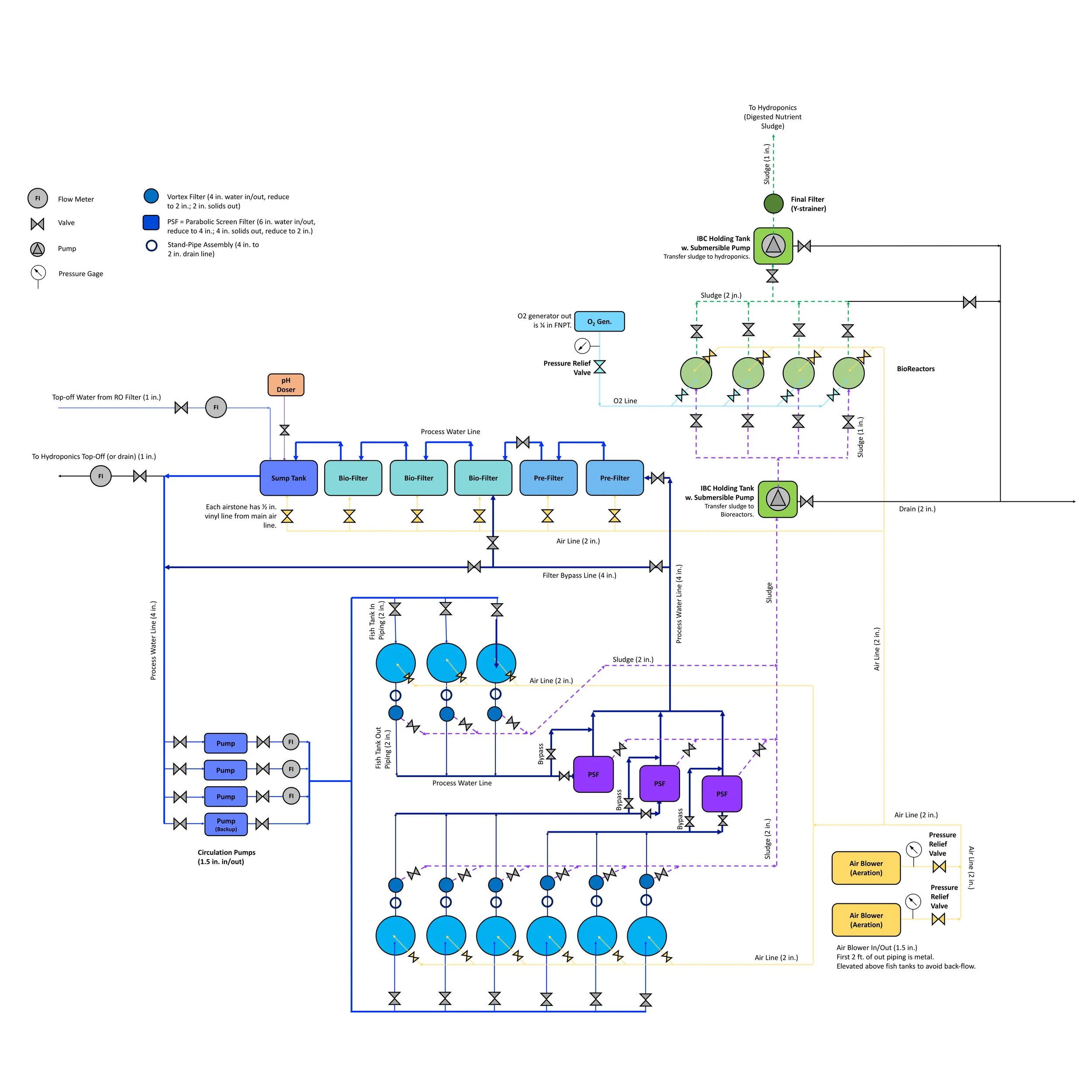 WaterFarmers was retained to provide detailed design services for a new vertical farm seeking to utilize aquaponic fertilizers. We calculated the required biomass of fish to supply the hydroponics production and the systems necessary to house the fish and treat the water - exploring several alternatives with the client. The design was for a decoupled system, where the recirculating aquaculture and hydroponics do not share the same water in series, but the solids from the fish water are collected and reacted before being inserted as fertilizer into the hyroponics part. Our work included delivery of a 3D model of the space, process and instrumentation diagrams, and component by component estimating for capital cost, helping the client to make decisions about which systems to invest in first.
